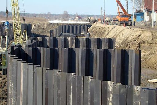 Эти конструкции делают из прочного металла. Профили плотно соединяются друг с другом, образуя герметичную стенку. Она не пропускает воду, держит грунт, выдерживает давление. Особенно часто в работе используют шпунт Ларсена – надежный, проверенный, удобный.